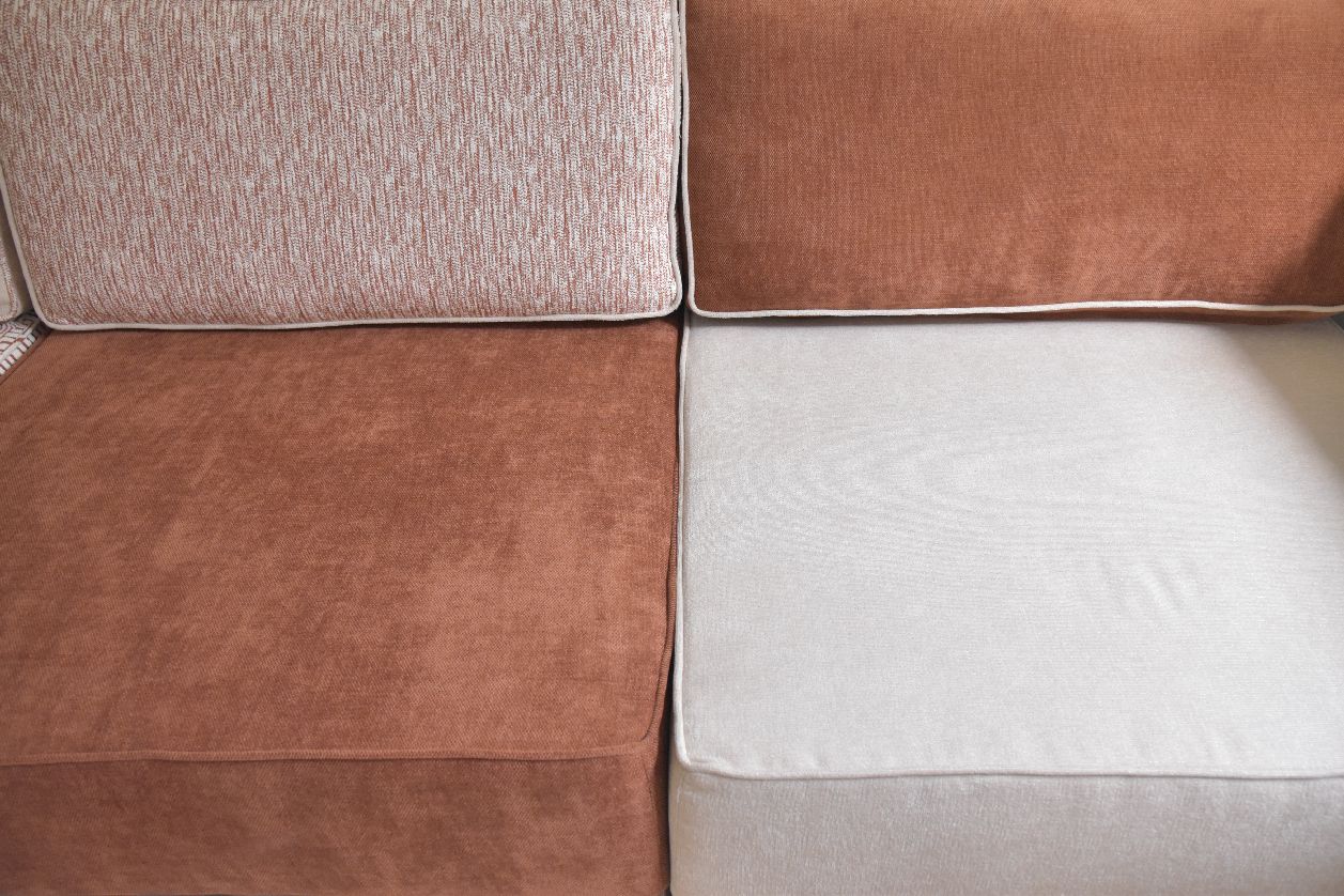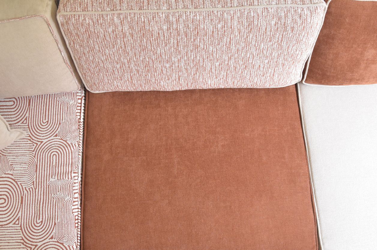 השילוב בין סוגי הבדים מעניק לפינה עומק ומראה יוקרתי אך נעים לעין ולמגע.